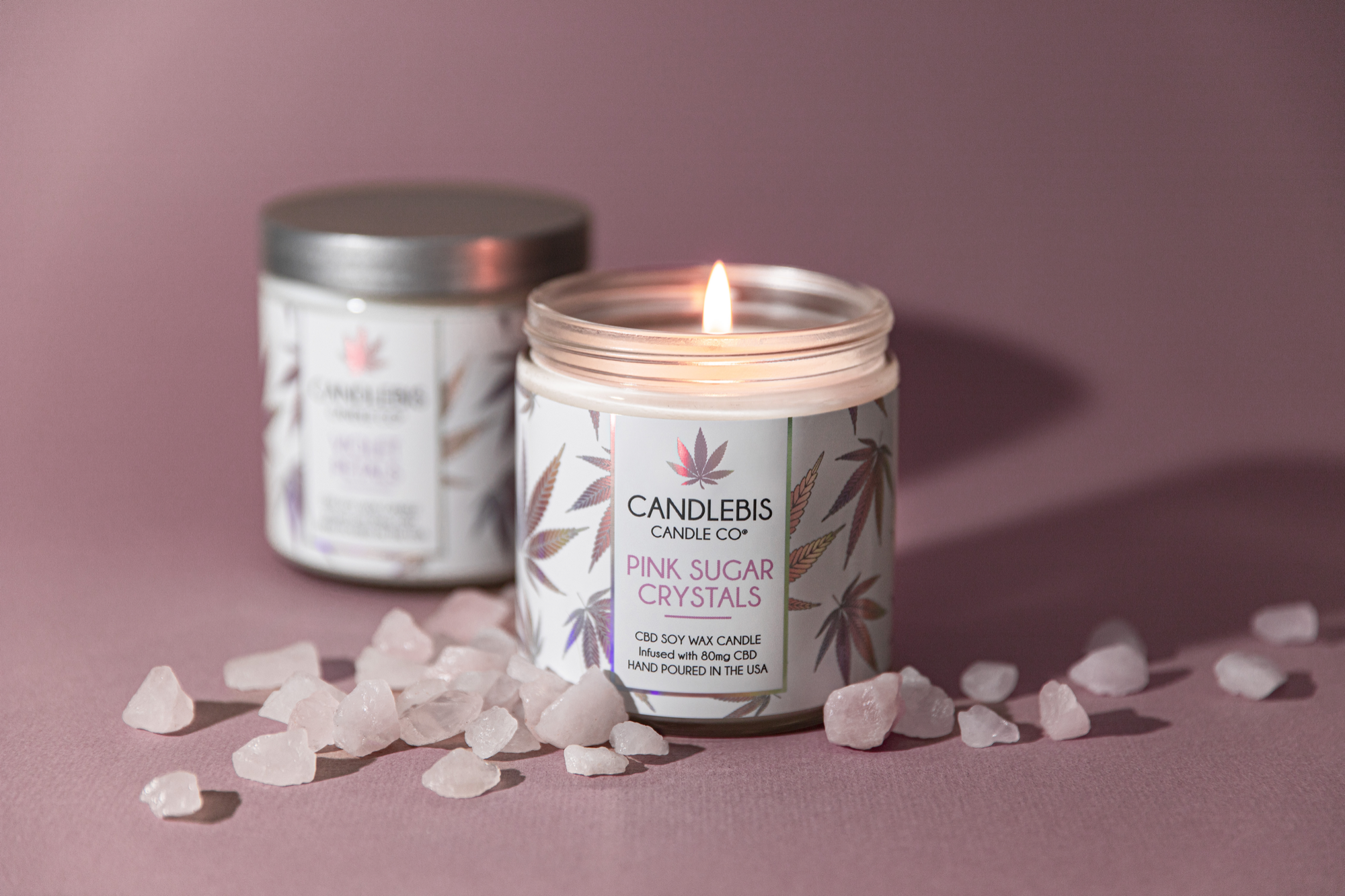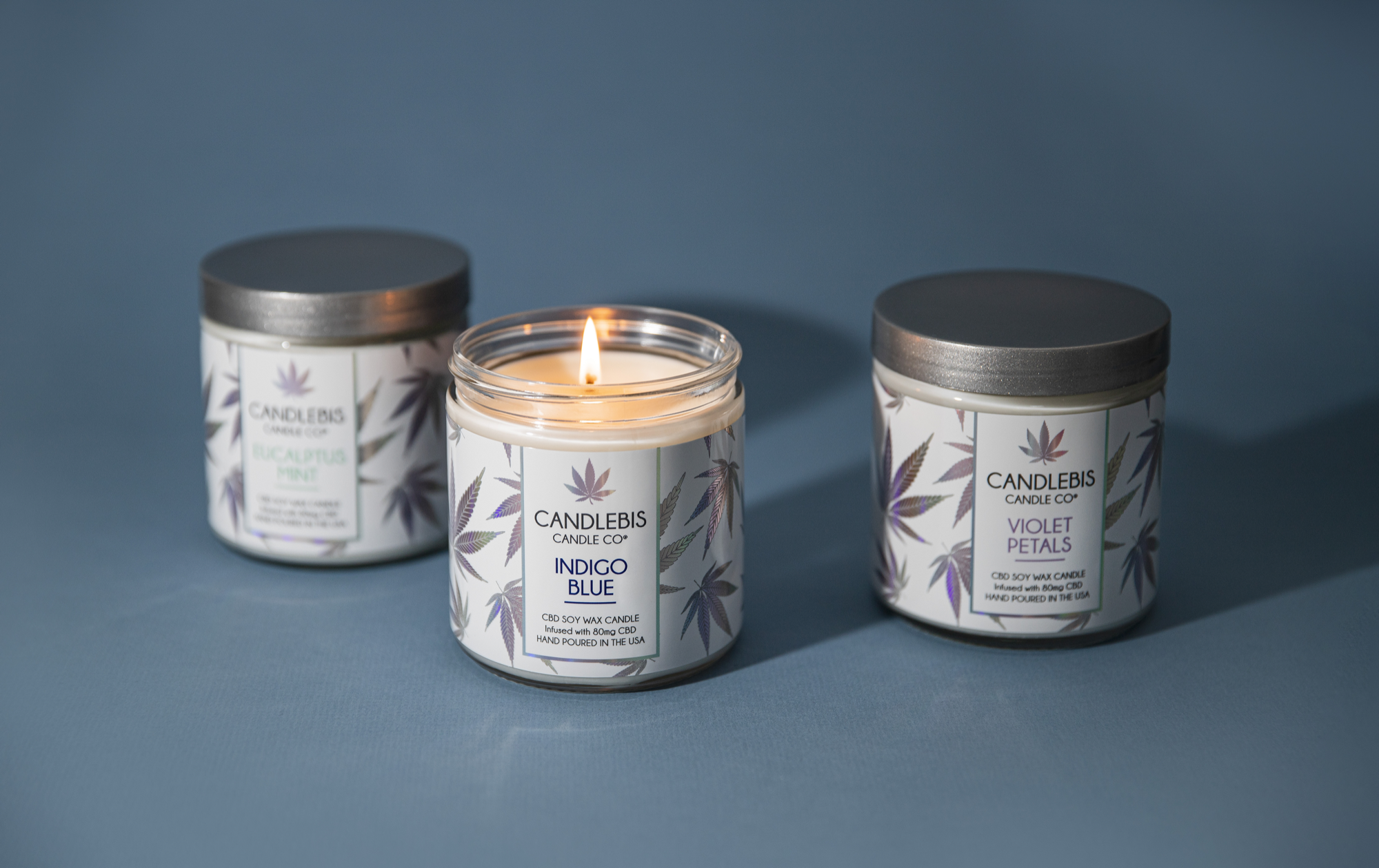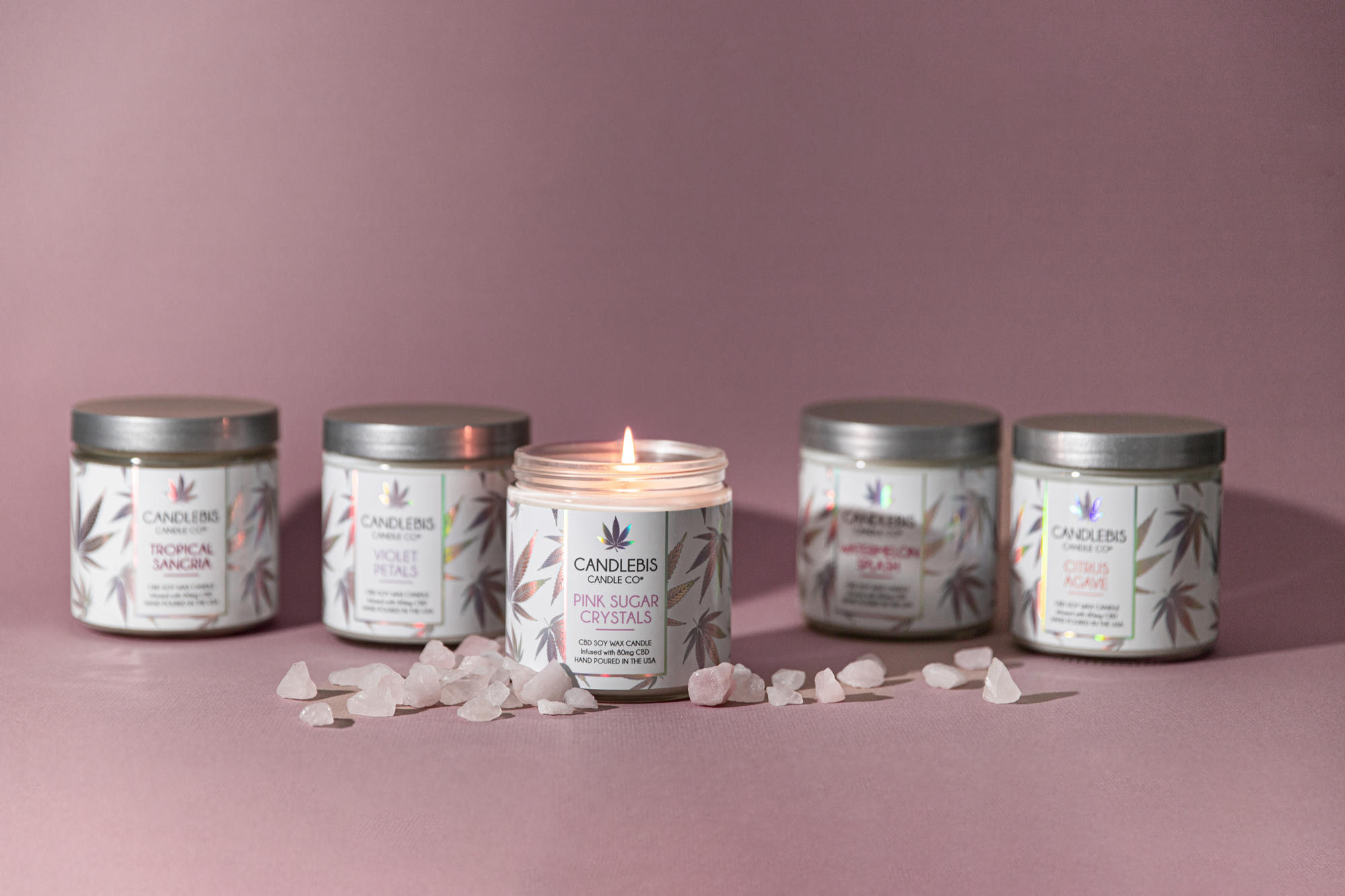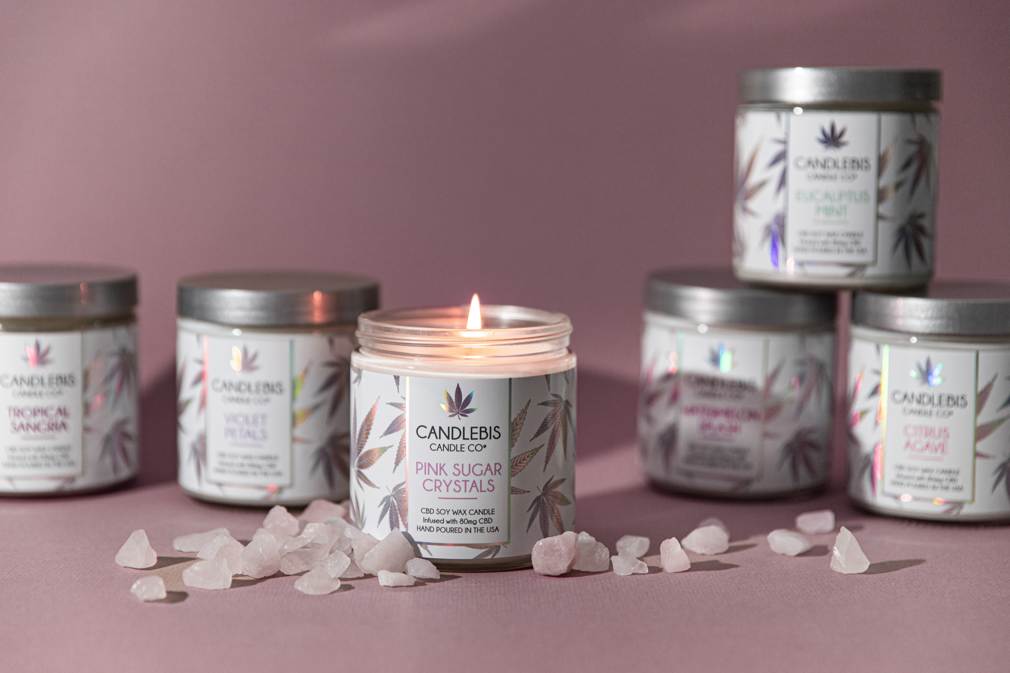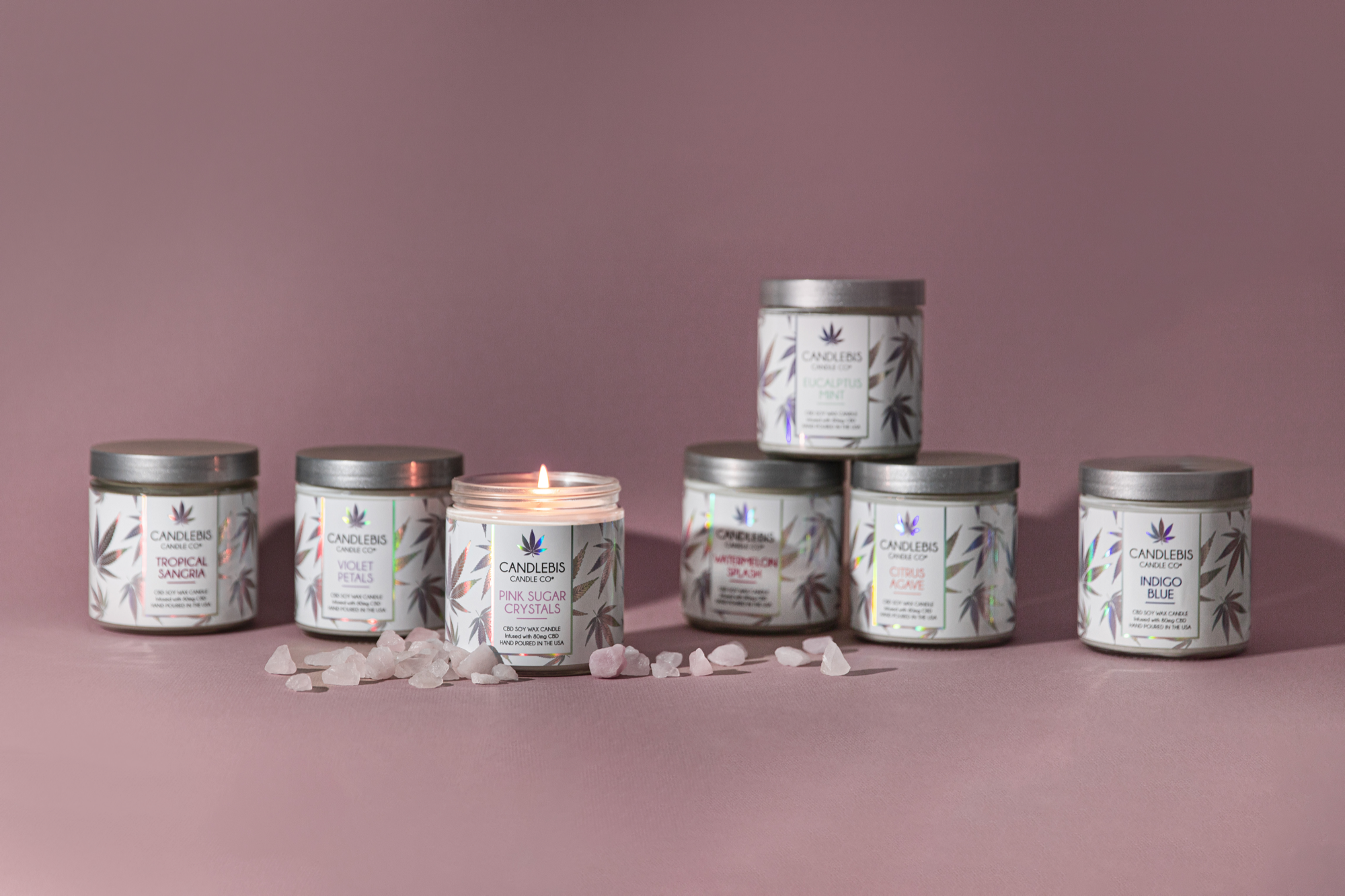 This label design for Candlebis was selected from a presentation of concept options and brought to life as their Iridescent Collection. To complement the pastel holographic foil full-wrap labels, I took a clean, minimal approach for the photography—letting the trippy detail work and subtle color shifts take center stage.