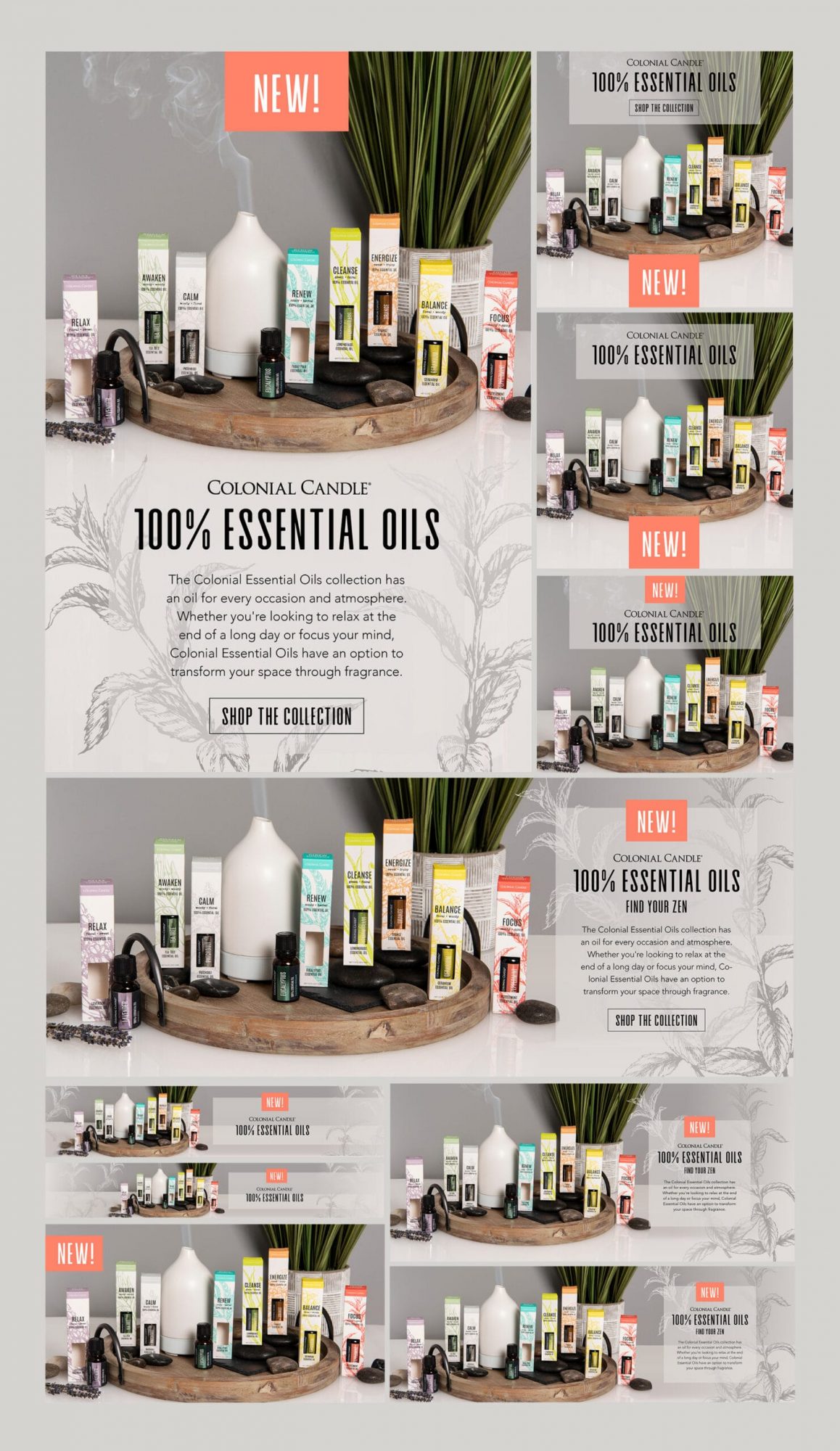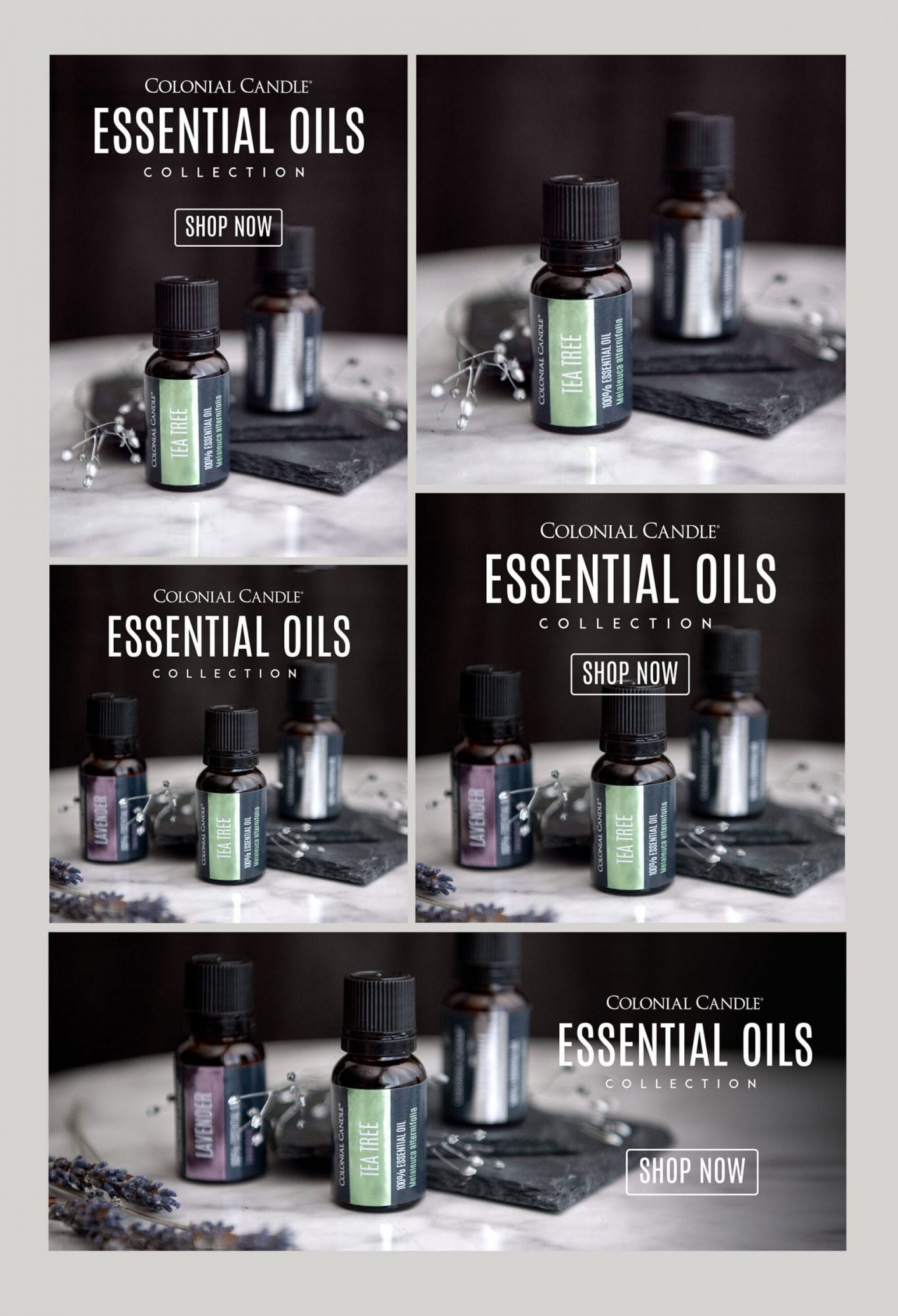 This bright & bold Essential Oils set by Colonial Candle featured all-natural and proven fragrances for aromatherapy. I photographed & designed advertising graphics sets for the collection's online launch.