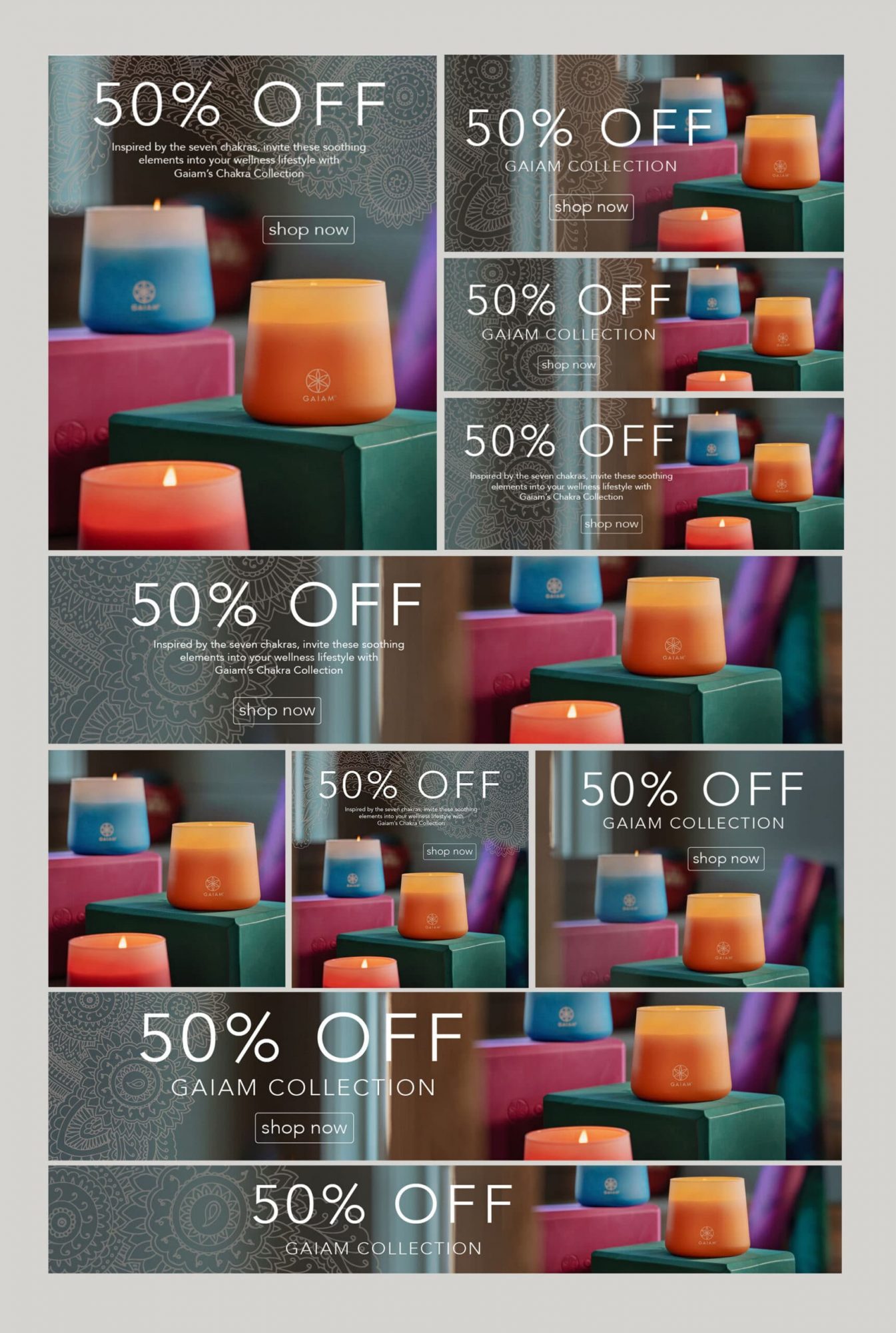 Emails, website banners, and marketing graphics in sizes for Facebook, Instagram, and Google Ads.